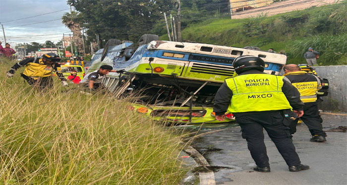 Bus colectivo volcó esta madrugada de miércoles 22 de octubre justo al ingresar al puente Tinco, ubicado en el kilómetro 15.5, zona 7 de Mixco. El piloto se dirigÃa de la colonia Belén hacia la ciudad capital cuando perdió el control y cayó del puente.