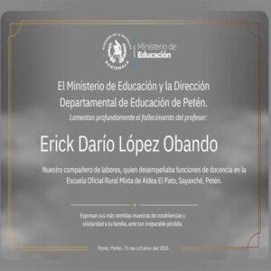 Tras confirmarse su fallecimiento, la Dirección Departamental de Educación de Petén lamentó el suceso.