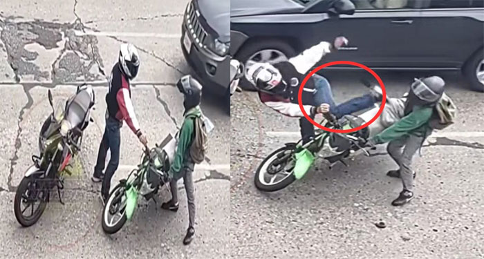 El otro motorista intenta sostener la motocicleta, pero tampoco logra mantener el equilibrio y la moto también cae al suelo. Pocos segundos después, otras dos personas intervienen y ambos hombres se retiran del lugar, aparentemente sin mayores consecuencias.