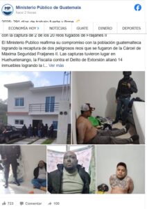 Este sábado 18 de octubre, a través de la FiscalÃa contra el Delito de Extorsión y con el apoyo de investigadores de DIPANDA. Se realizaron distintos allanamientos en el departamento de Huehuetenango, donde se logró la recaptura de dos de los 20 reos fugados de Fraijanes II.
