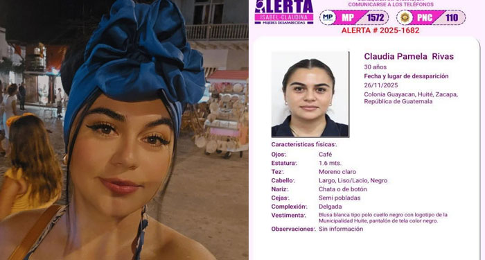 La desaparición de Claudia Pamela Rivas, de 30 años, actual directora financiera de la Municipalidad de Huite, Zacapa, ha generado preocupación entre sus familiares, compañeros de trabajo y autoridades locales. La profesional fue vista por última vez el miércoles 26 de noviembre en la colonia Guayacán, según la información consignada en la alerta emitida por el sistema de búsqueda de mujeres.