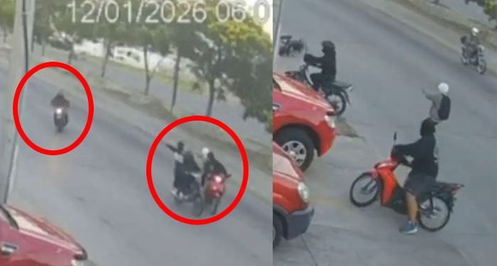 Los hechos ocurrieron a las 18:01 horas del lunes 12 de enero en la calle Isidro Casanova. La escena quedó registrada por una cámara de seguridad instalada en un centro médico ubicado frente al lugar del ataque. En las imágenes se observa cómo dos motocicletas con cuatro sujetos interceptan a un hombre que circulaba solo en su unidad. Los agresores lo amenazan con armas de fuego para obligarlo a detenerse y entregarla.