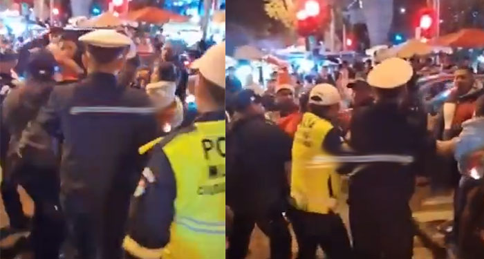 Las imágenes, de apenas 13 segundos, muestran a un hombre utilizando un gorro alusivo a Santa Claus golpeándose con otro individuo vestido completamente de negro. Ambos intercambian puñetazos mientras varias personas observan sin intervenir.