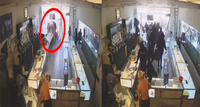 Videos difundidos muestran que el vehÃculo chocó contra la fachada de la joyerÃa. Haciéndolo parecer un accidente, pero segundos después aparece un grupo de hombres armados y vestidos de negro que ingresan al local y comienzan a destruir las vitrinas con herramientas para sustraer objetos de valor.