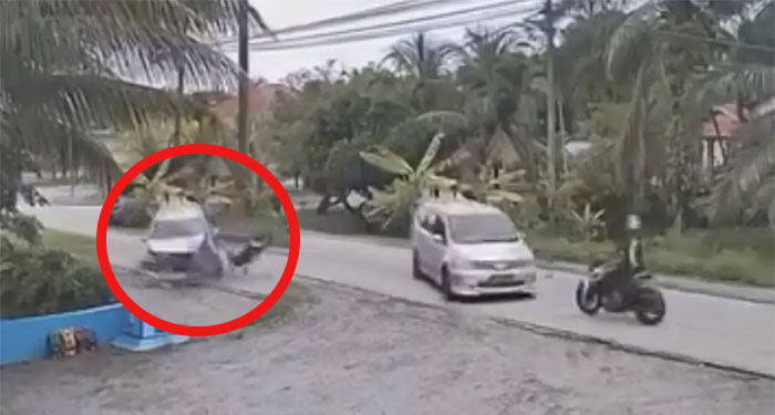 Impactante accidente captado en video muestra a un motorista caer a un riachuelo tras colisión.